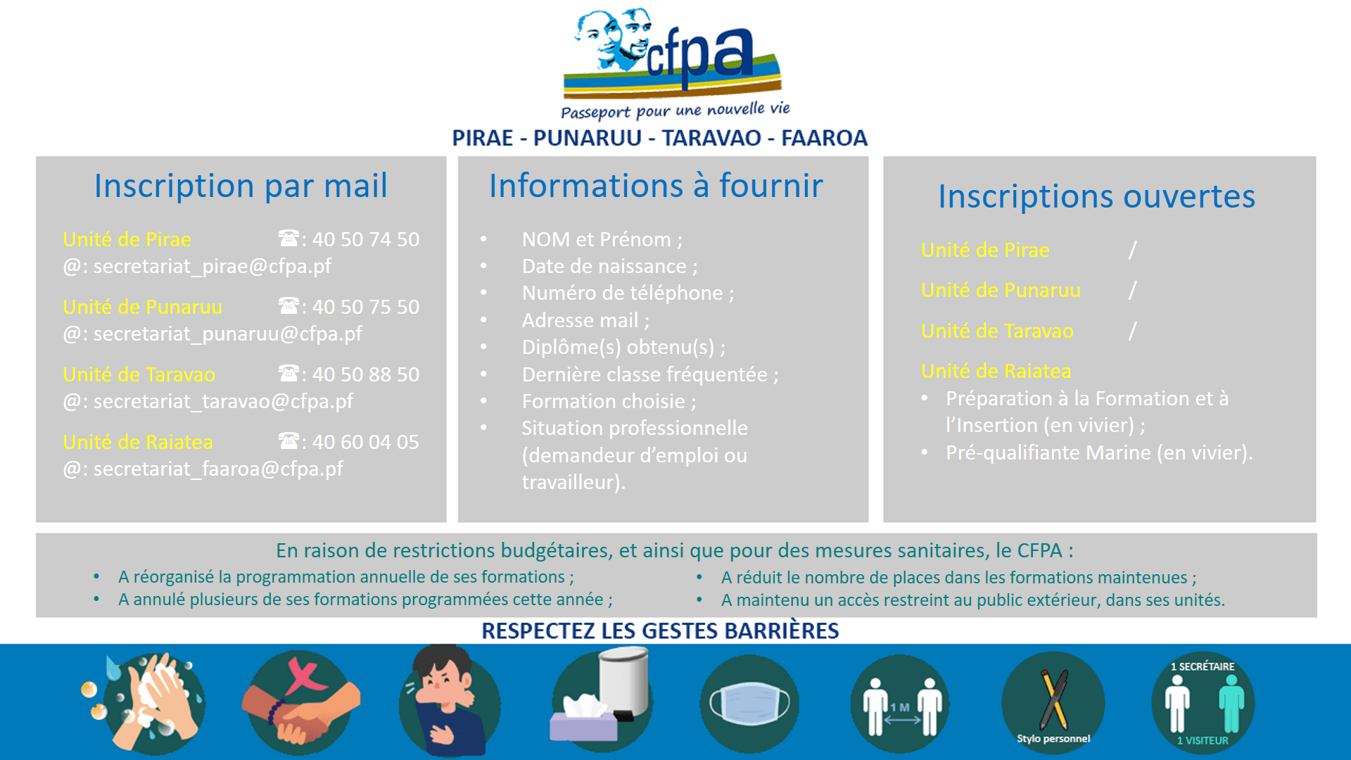 View Post Les formations que proposent le CFPA de Raiatea CFPA 14 décembre 2023 Actualités, Les formations ouvertes et fermés, Recrutement des stagiaires Le CFPA de Raiatea propose un large choix de formations, donc n’attends plus et viens vite nous rejoindre dans cette aventure .Inscriptions ouvertes toute l’année soit sur https://www.cfpa.pf/inscription/ ou soit directement au CFPA de FAAROA.