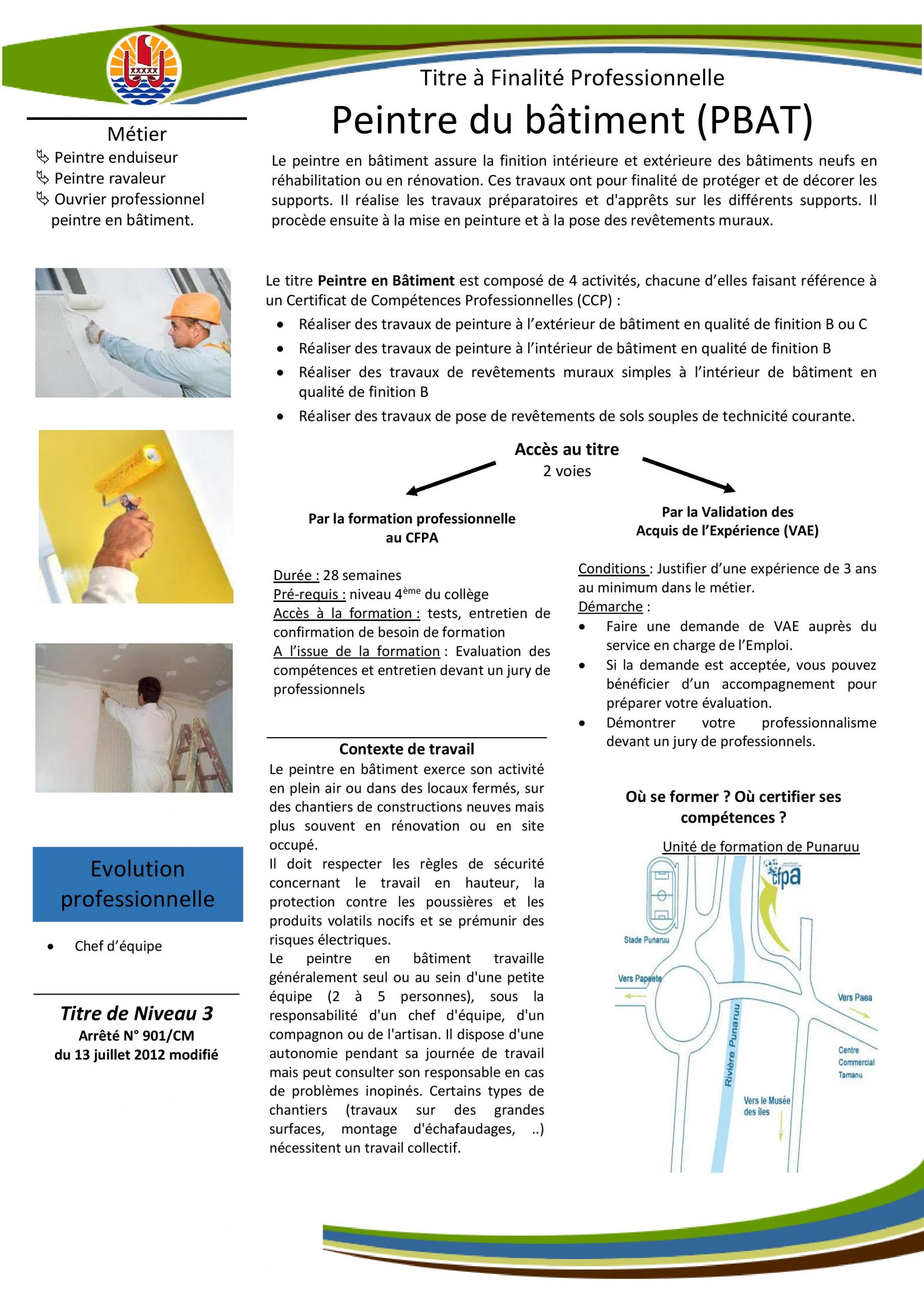 Télécharger la fiche de formation S'inscrire à l'unité de Pirae Télécharger la fiche de formation S'inscrire à l'unité de Pirae Besoin de renseignement ? Contactez-nous Besoin de renseignement ? Contactez-nous Où se former ? Où certifier ses compétences ? Unité de formation de Punaruu - Tel : 40 50 75 50