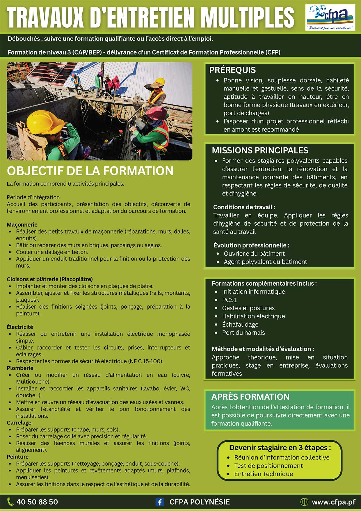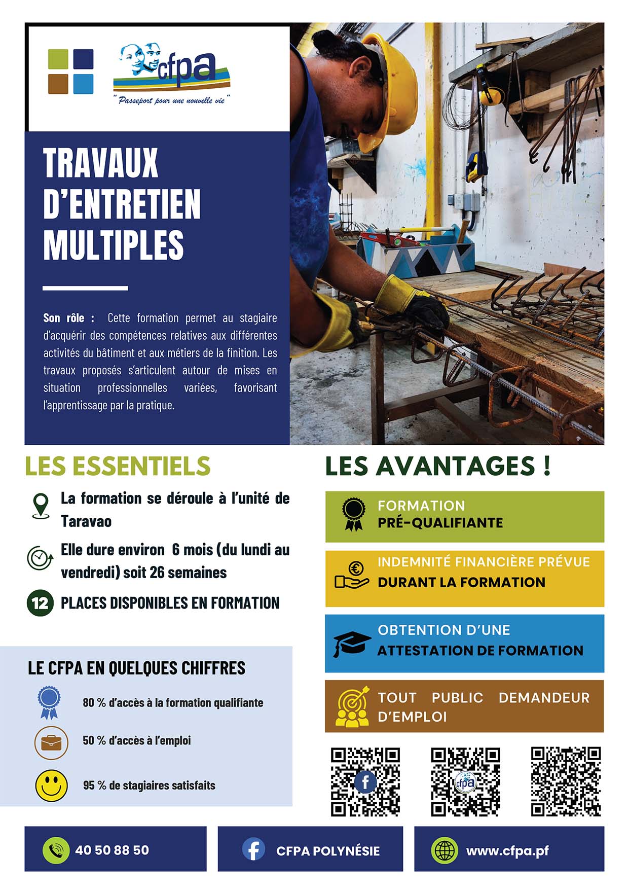 Télécharger la fiche de formation S'inscrire à l'unité de Taravao Télécharger la fiche de formation S'inscrire à l'unité de Taravao Besoin de renseignement ? Contactez-nous Besoin de renseignement ? Contactez-nous Où se former ? Où certifier ses compétences ? Unité de formation de Taravao - Tel : 40 50 88 50 Unité de formation de Raiatea - Tel : 40 60 04 05