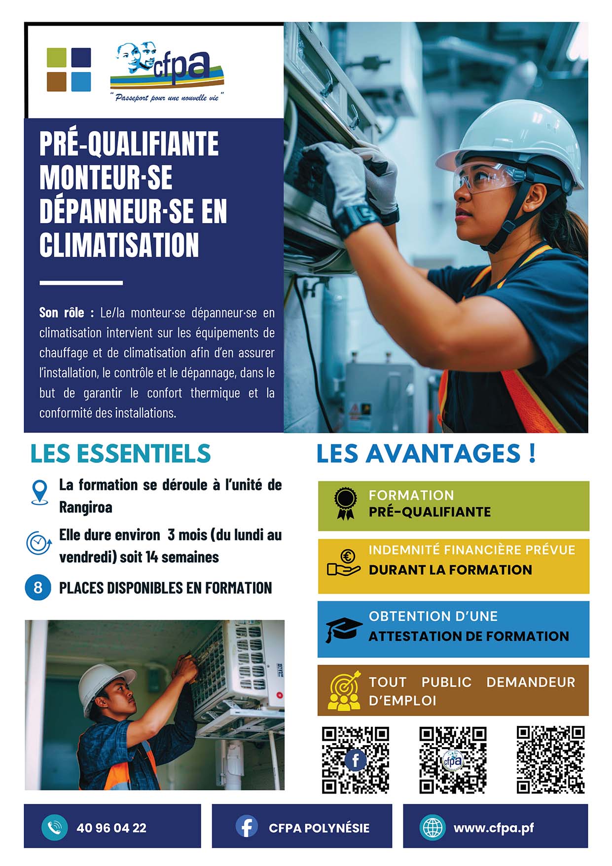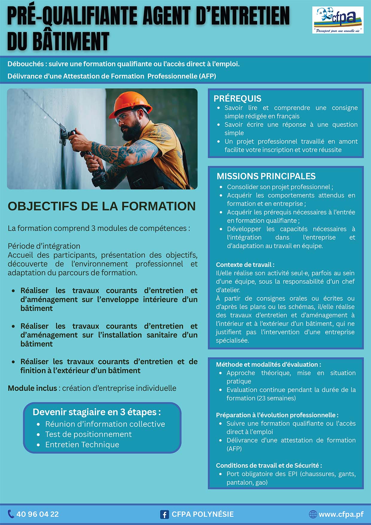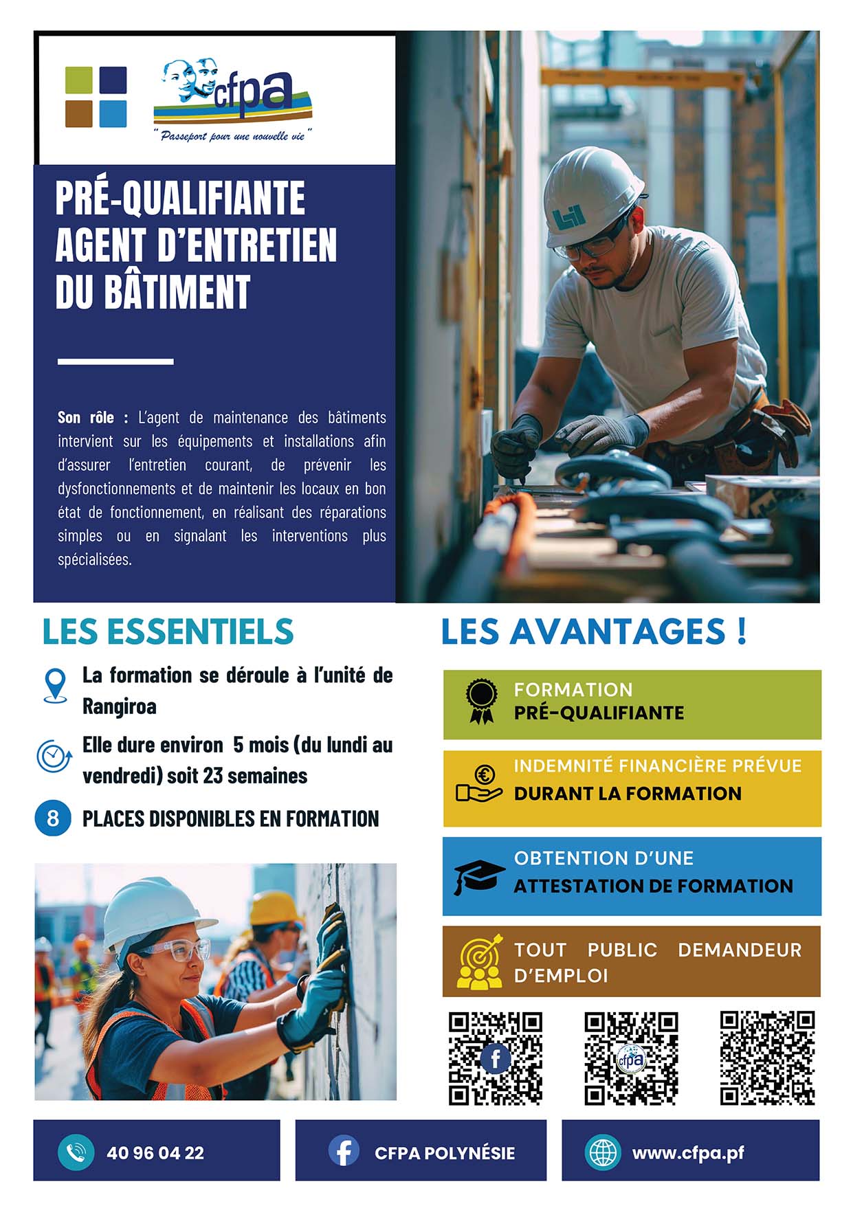 Les formations dispensées à l'unité de Rangiroa CALENDRIER des formations Préqual Agent d’Entretien du Bâtiment (A.E.B.) Préqual Electricien d’Equipement du Bâtiment (E.E.B.) Préqual Mécanicien(ne) Automobile (M.A.) Préqual Mécanicien(ne) Réparateur en Marine de Plaisance (M.R.M.P.) Préqual Monteur Dépanneur en Climatisation (M.D.C.)