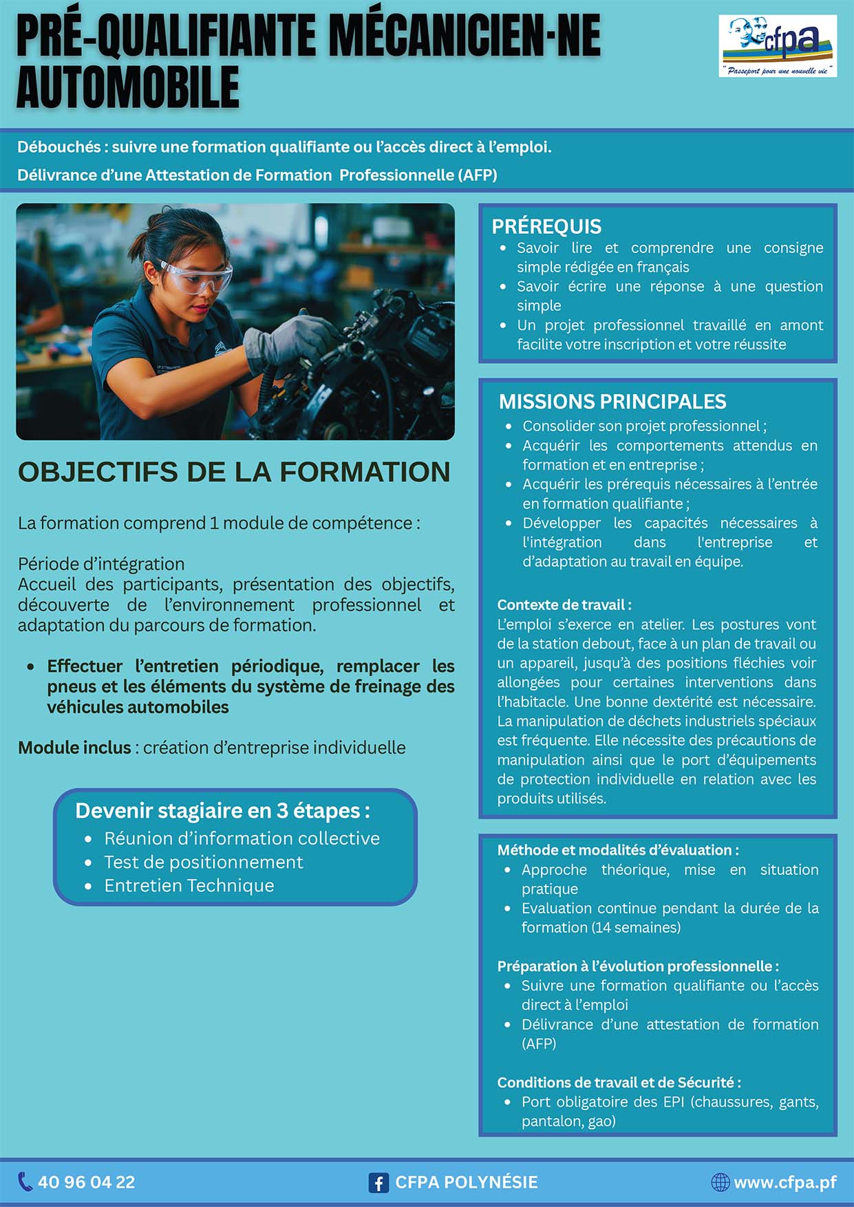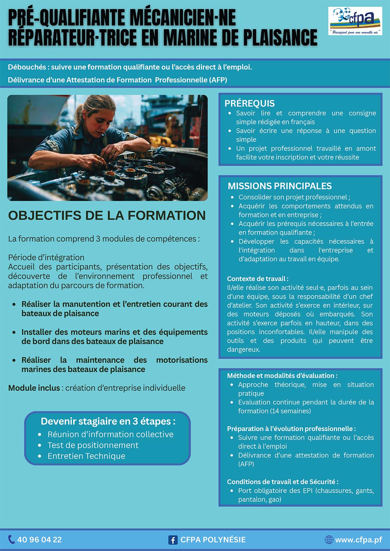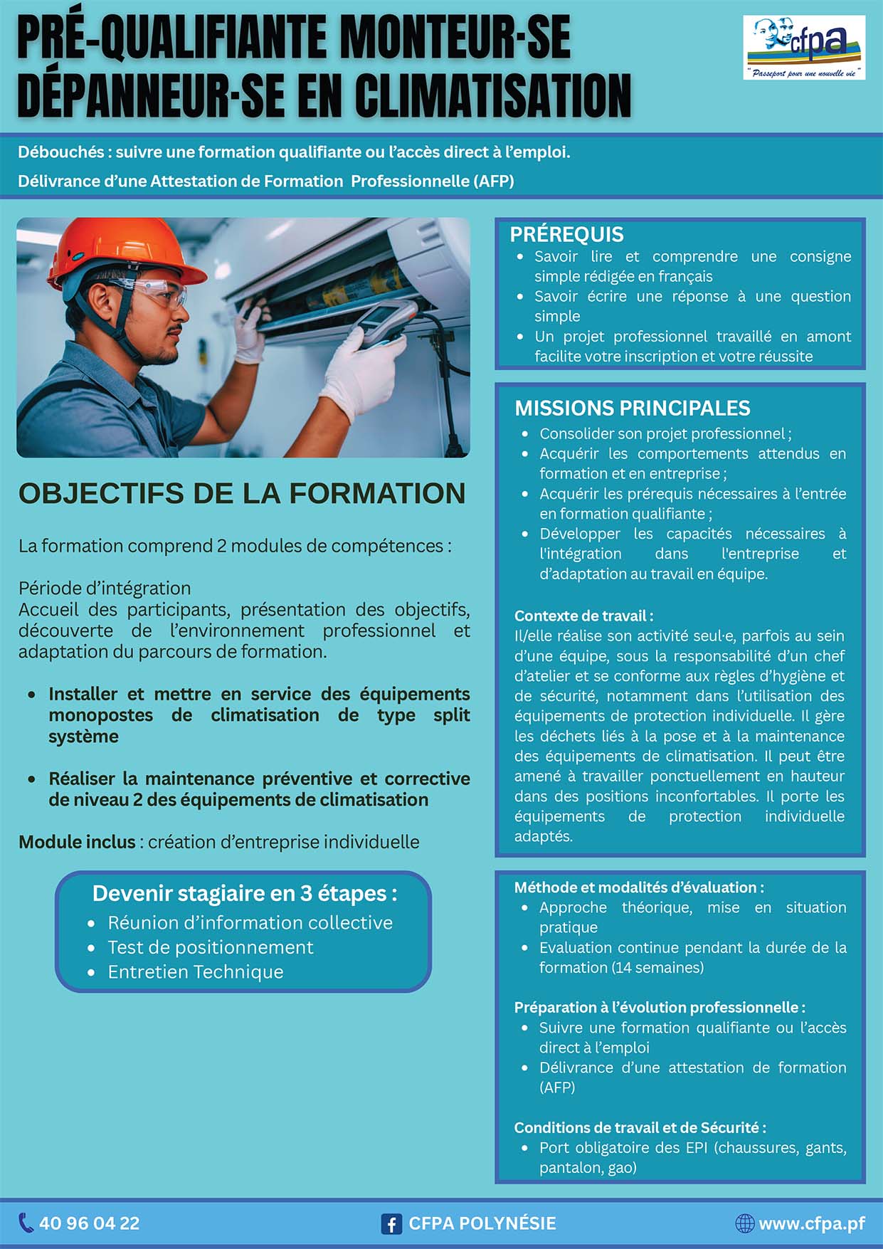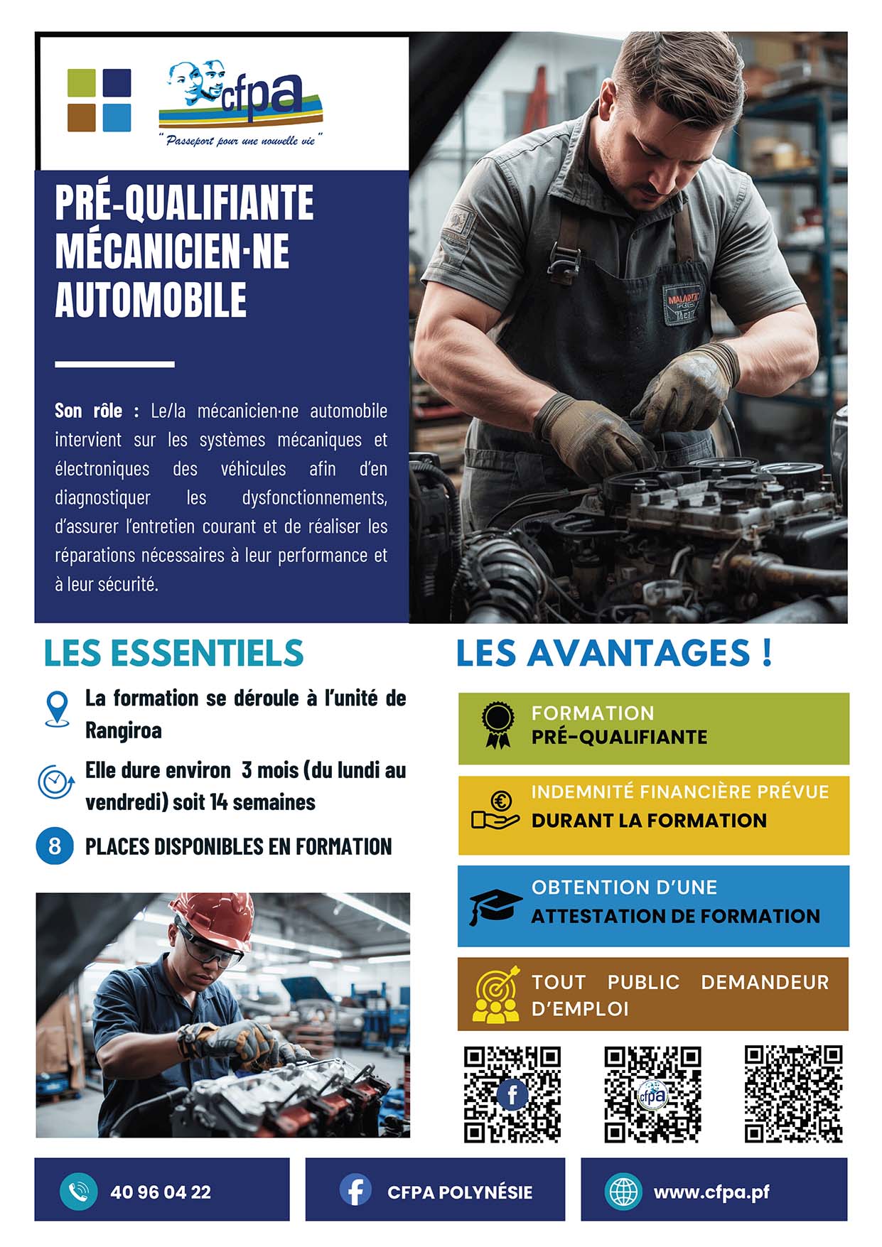 Les formations dispensées à l'unité de Rangiroa CALENDRIER des formations Préqual Agent d’Entretien du Bâtiment (A.E.B.) Préqual Electricien d’Equipement du Bâtiment (E.E.B.) Préqual Mécanicien(ne) Automobile (M.A.) Préqual Mécanicien(ne) Réparateur en Marine de Plaisance (M.R.M.P.) Préqual Monteur Dépanneur en Climatisation (M.D.C.)