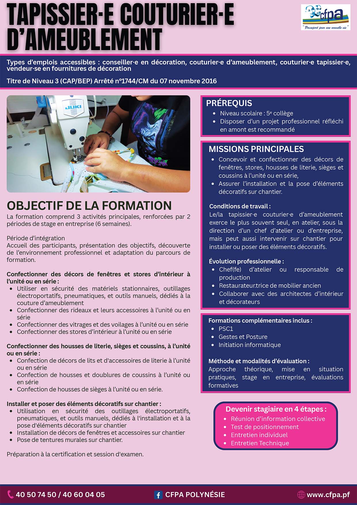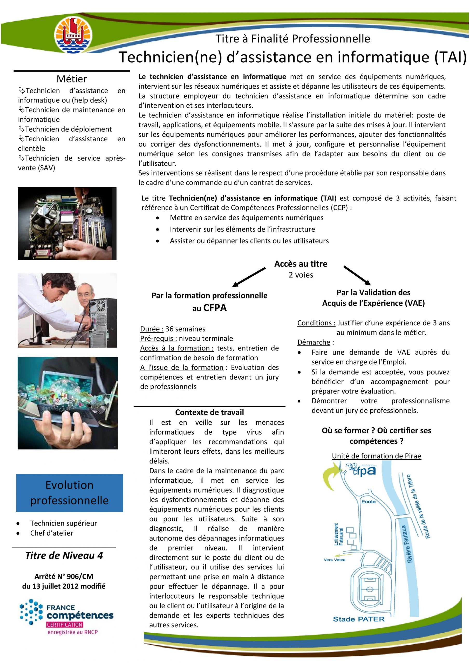 Les formations du domaine Tertiaire et Services Date d'inscription Tapissier Couturier d'Ameublement (T.C.A.) Technicien Informatique de Proximité (T.I.P.) Technicien(ne) d’Assistance en Informatique (T.A.I.) « Précédent 1 2