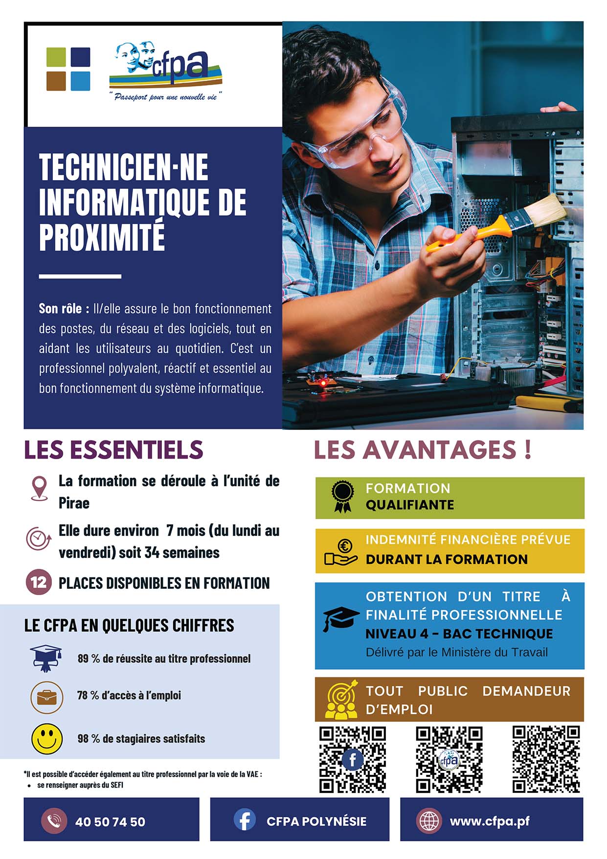 Télécharger la fiche de formation S'inscrire à l'unité de Pirae Télécharger la fiche de formation S'inscrire à l'unité de Pirae Besoin de renseignement ? Contactez-nous Besoin de renseignement ? Contactez-nous Où se former ? Où certifier ses compétences ? Unité de formation de Pirae - Tel : 40 50 74 50