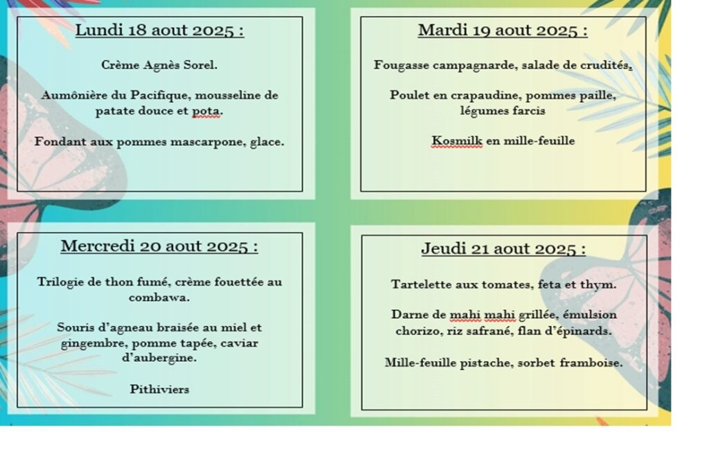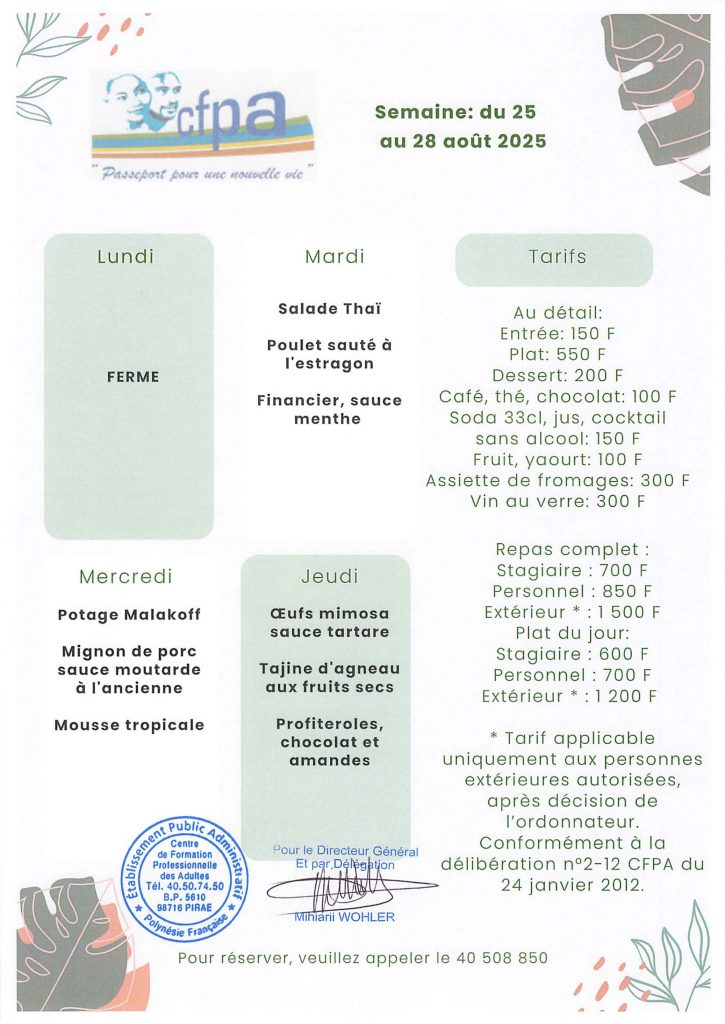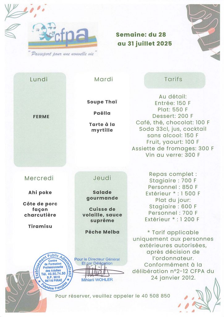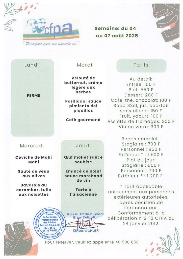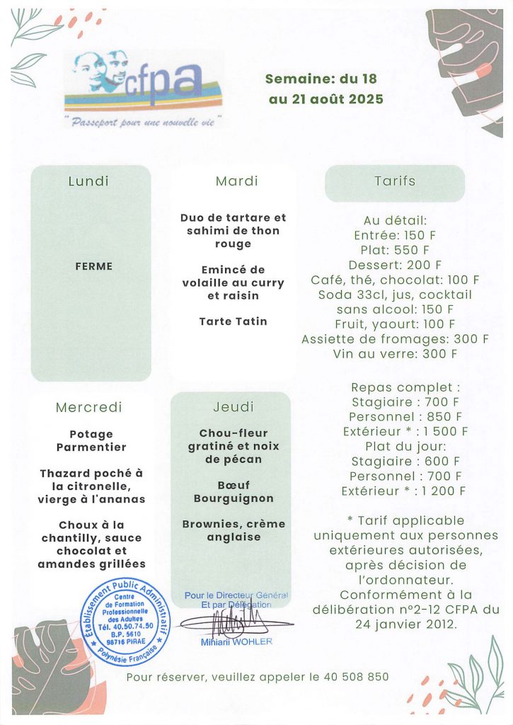 Restaurants pédagogiques Les plats des stagiaires Le restaurant pédagogique permet aux stagiaires de mettre en pratique leur formation. Il est ouvert aux stagiaires, au personnel du CFPA et aux personnes extérieures du CFPA acceptées après décision de l’ordonnateur. Les menus des 3 restaurants pédagogiques Menu du restaurant pédagogique de Taravao du 25 au 28 Août 2025 22-08-2025 Voir plus Menu du restaurant pédagogique de Pirae du 25 au 28 Août 2025 22-08-2025 Voir plus Menu du restaurant pédagogique de Pirae du 18 au 21 Août 2025 18-08-2025 Voir plus Menu du restaurant pédagogique de Taravao du 18 au 21 Août 2025 08-08-2025 Voir plus Menu du restaurant pédagogique de Taravao du 04 au 07 Août 2025 01-08-2025 Voir plus Menu du restaurant pédagogique de Pirae du 28 au 31 Juillet 2025 25-07-2025 Voir plus Menu du restaurant pédagogique de Taravao du 28 au 31 Juillet 2025 25-07-2025 Voir plus Menu du restaurant pédagogique de Pirae du 21 au 24 Juillet 2025 18-07-2025 Voir plus 1 2 3 … 11 Suivant » ACCUEIL